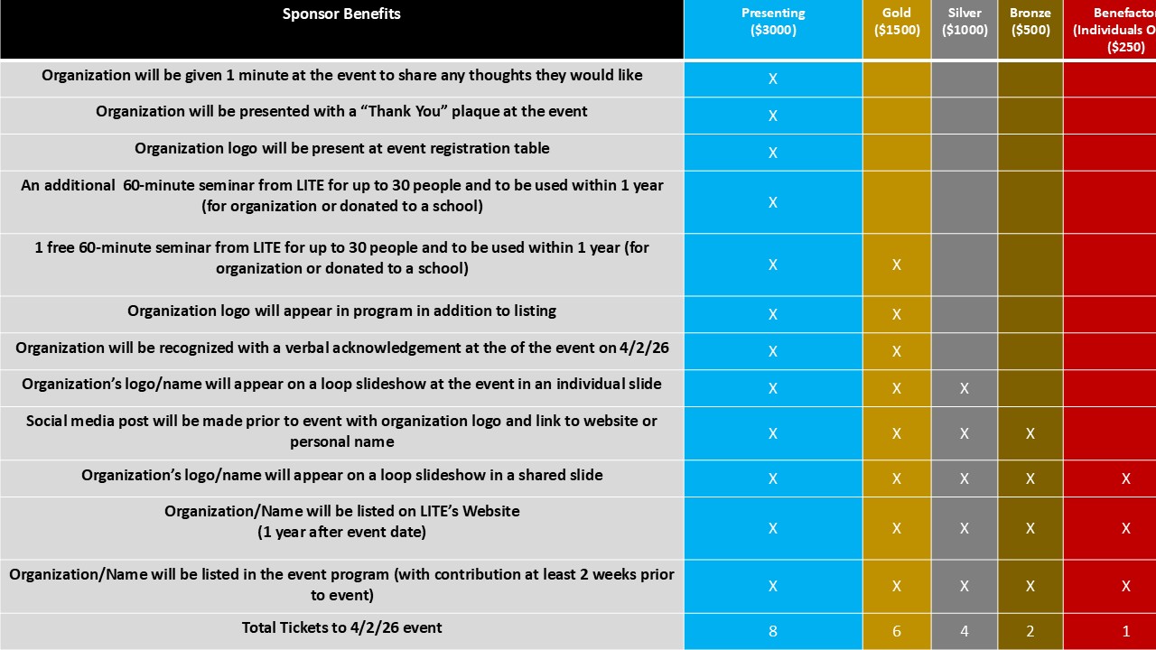 LITE Events 2026 5th Annual Fundraiser Sponsors Tickets/Sponsorships 2025 4th Annual Fundraiser Sponsors